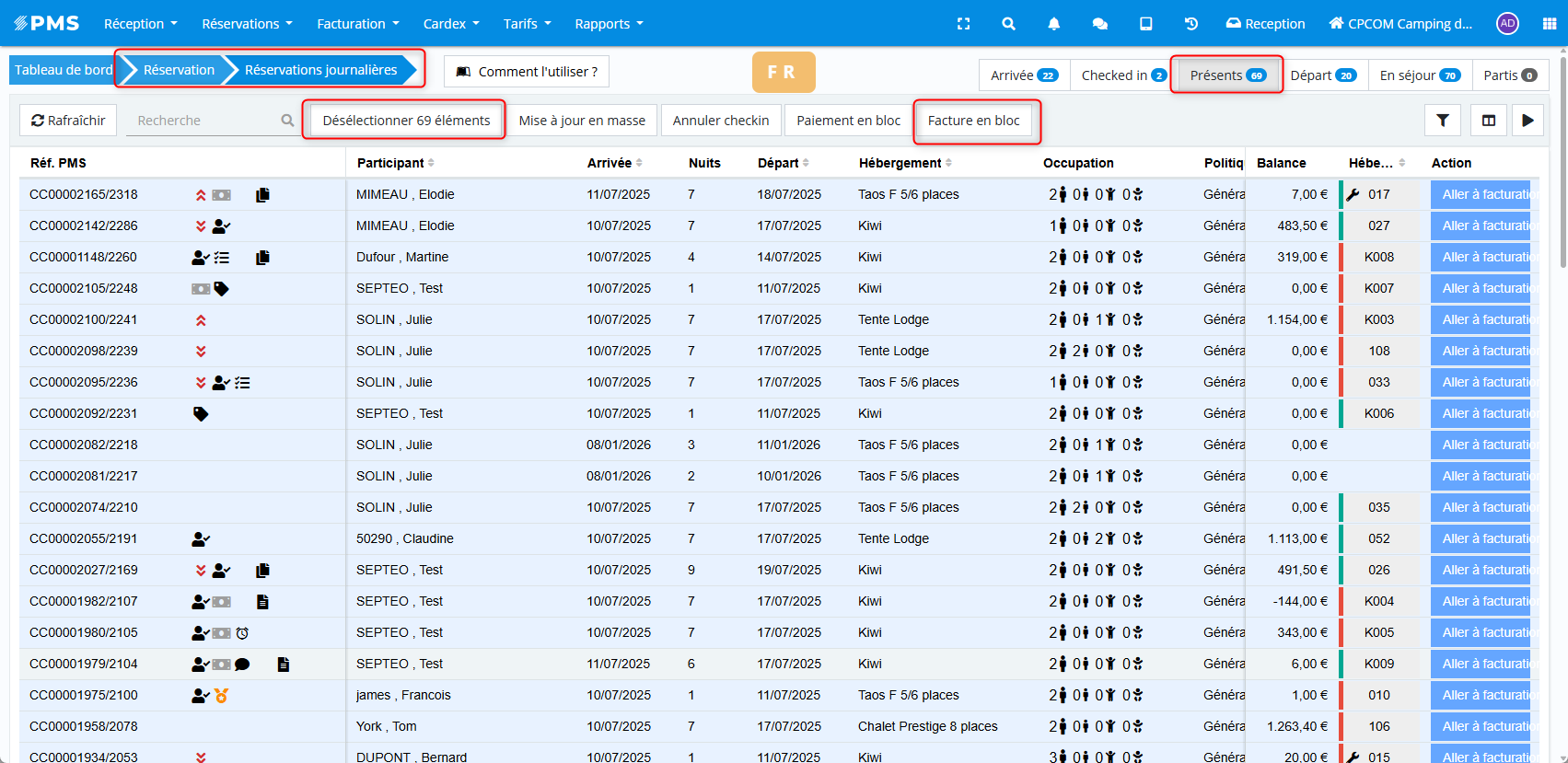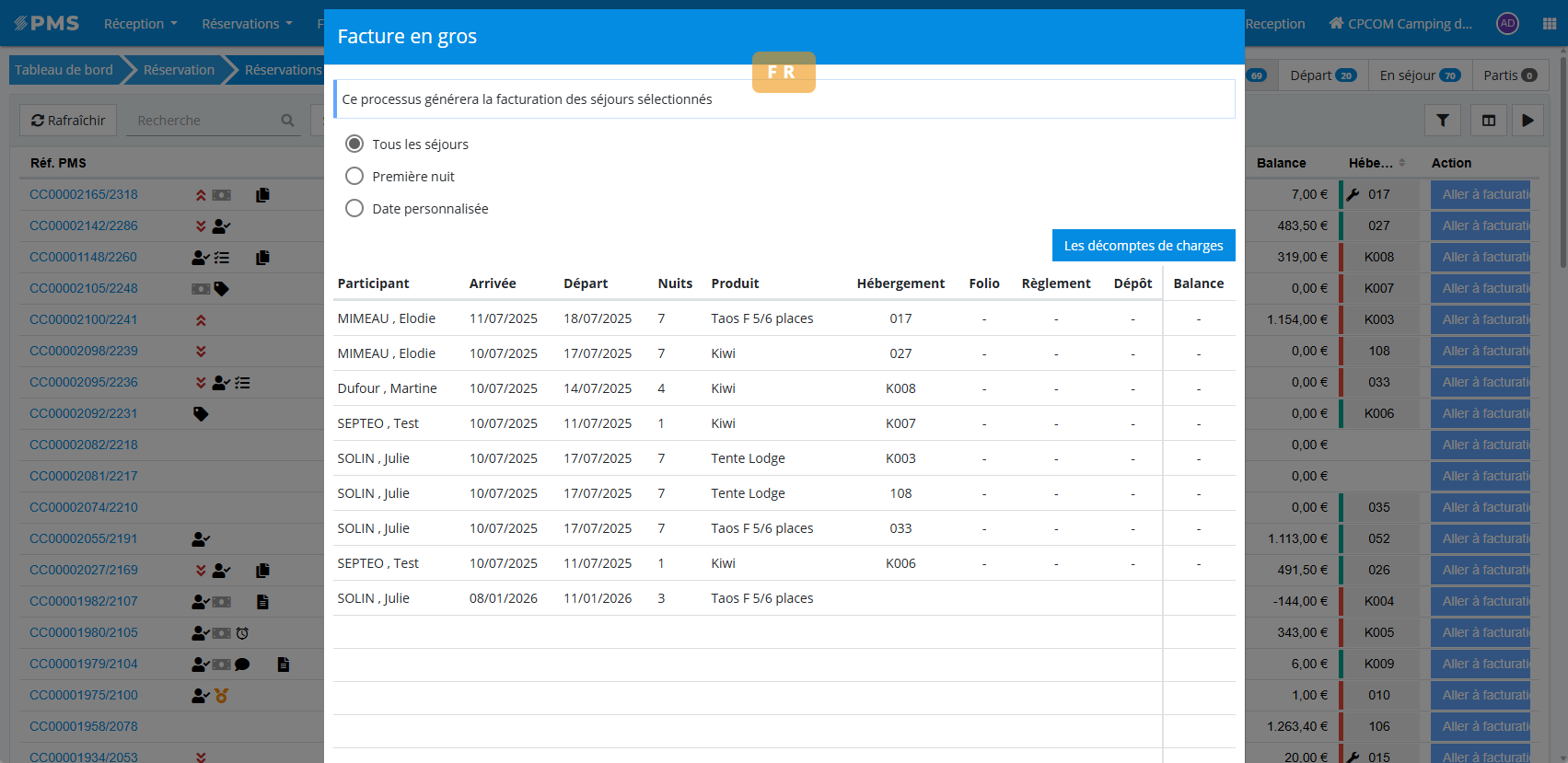 Réception / Séjours > Sélection des réservations > Facturation en masse