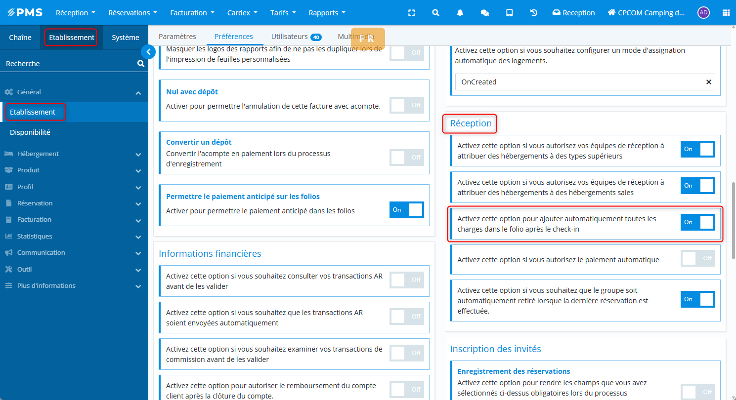 Établissement > Préférences > Ajout automatique dans le folio