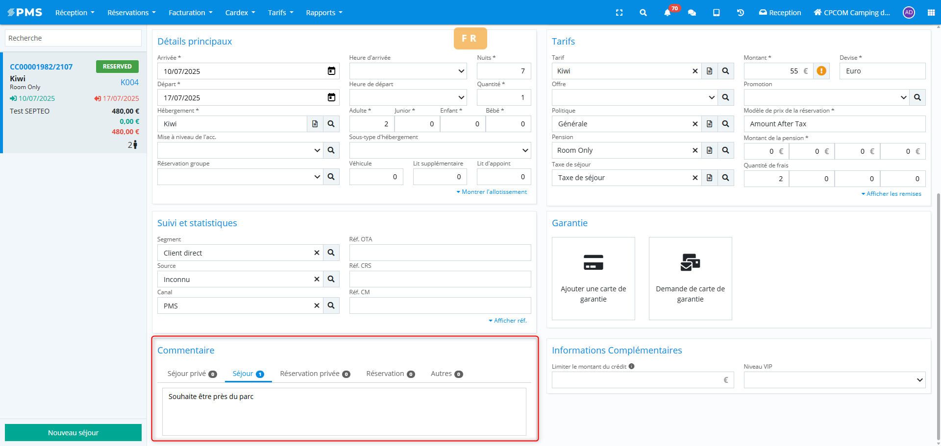 Une réservation peut contenir de nombreux commentaires issus de différentes sources (séjour, réservation, tarif, entreprise, etc.). Ces informations permettent de personnaliser au maximum le séjour des clients et d’améliorer le suivi par les équipes.