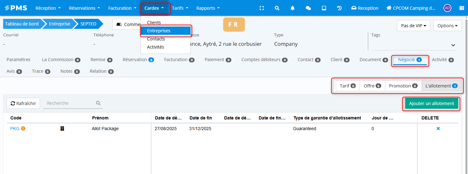 Lorsqu’un accord commercial est conclu avec une entreprise, Ulyses Suite permet de lui attribuer un tarif, une offre, une promotion ou un allotement négocié.
