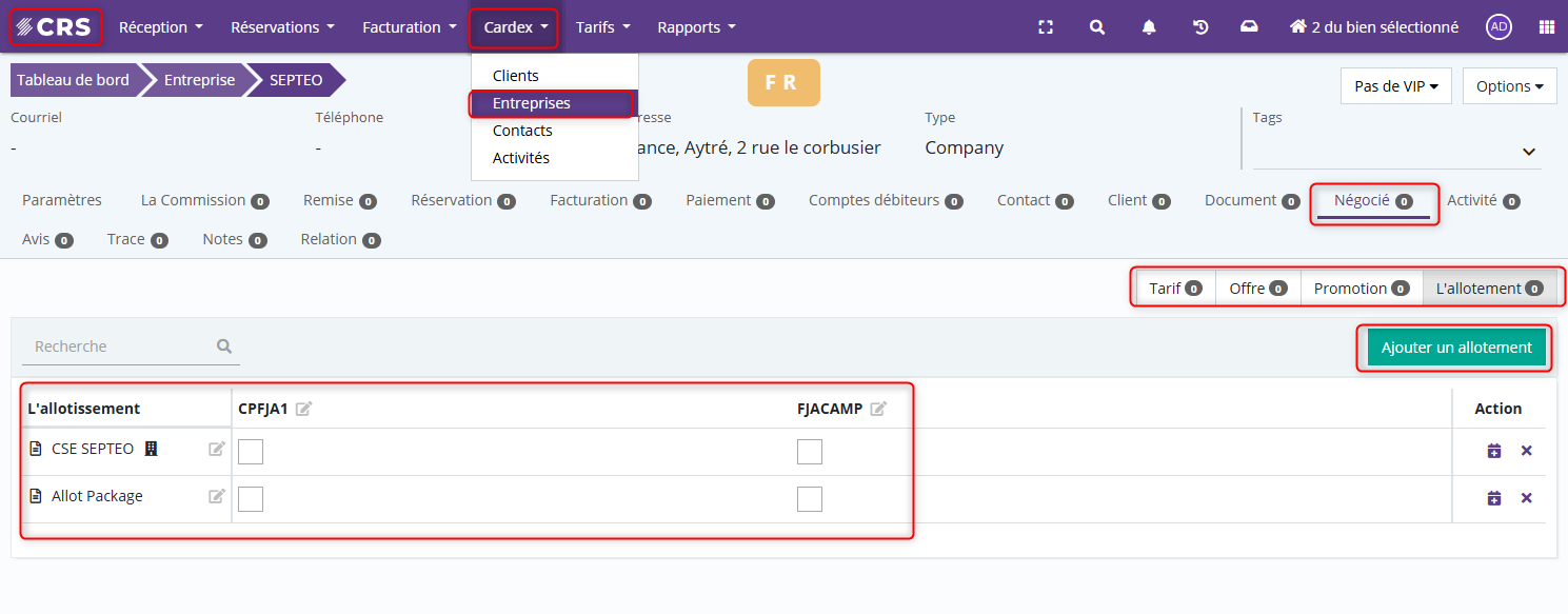 Attribution d’un tarif négocié ou d’un allotement à une entreprise partenaire.