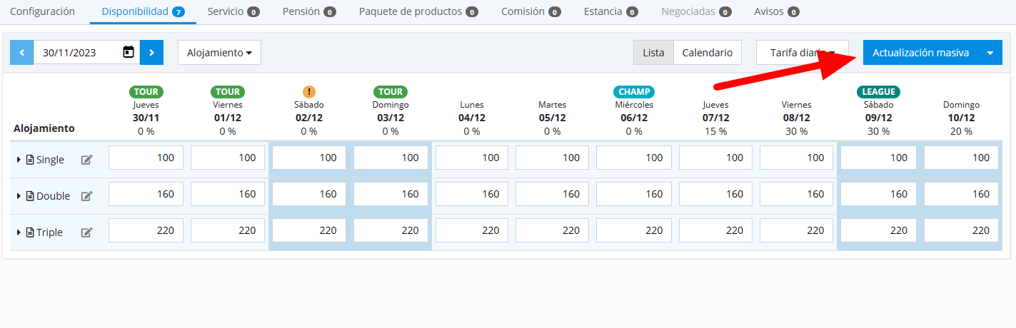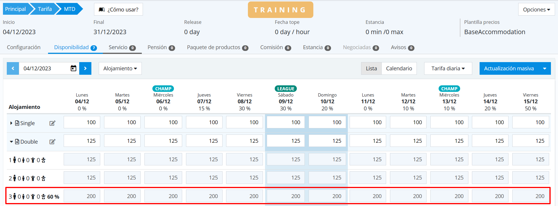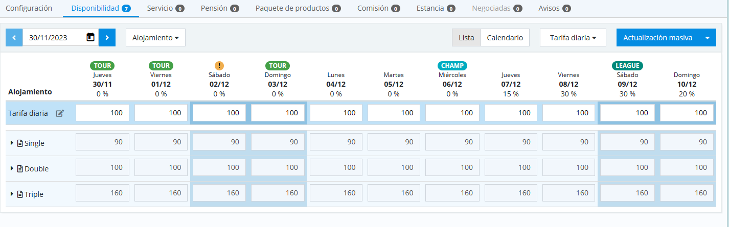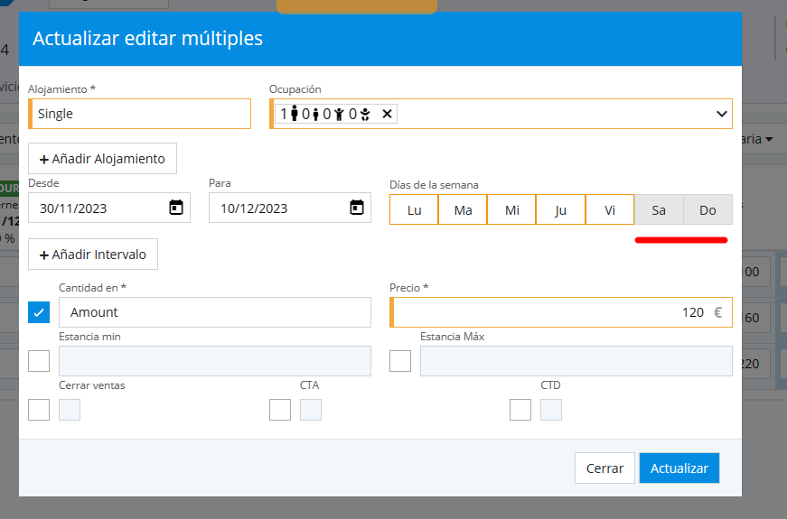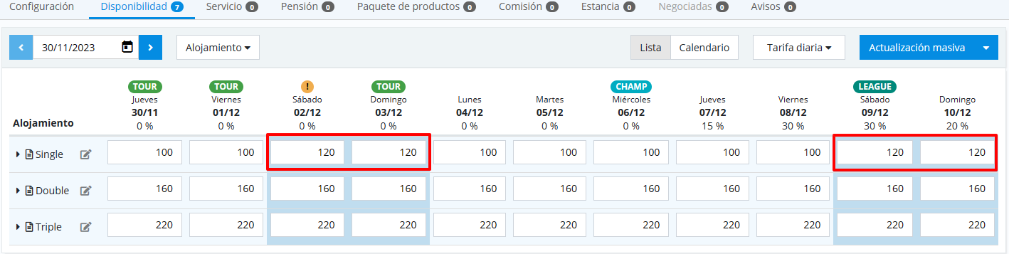 Par exemple, nous voulons modifier le prix de la Single à 120€ tous les samedis et dimanches entre le 30/11 et le 10/12.