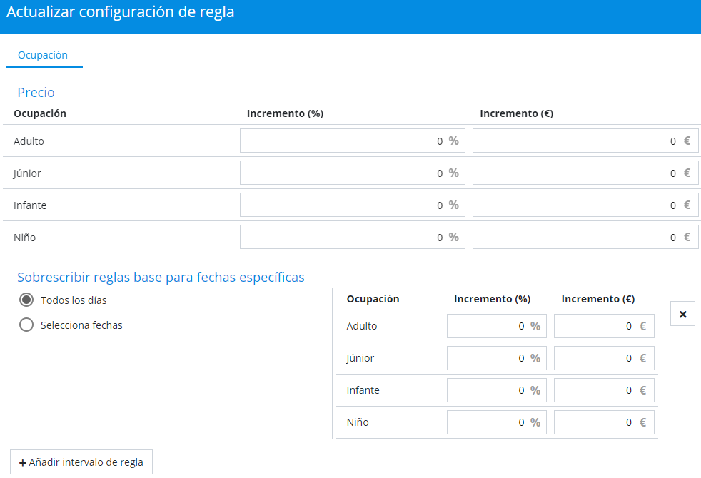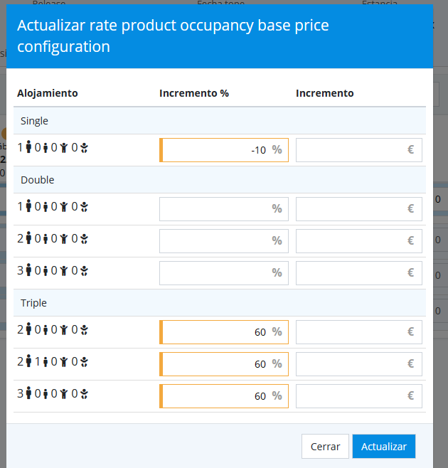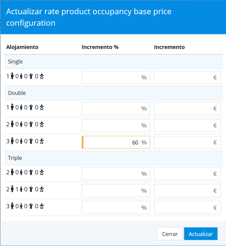 Il est possible d'appliquer des augmentations de prix en pourcentage (%) ou en valeurs absolues (€) à différents types d'occupation, tels qu'adultes, juniors, nourrissons et enfants.