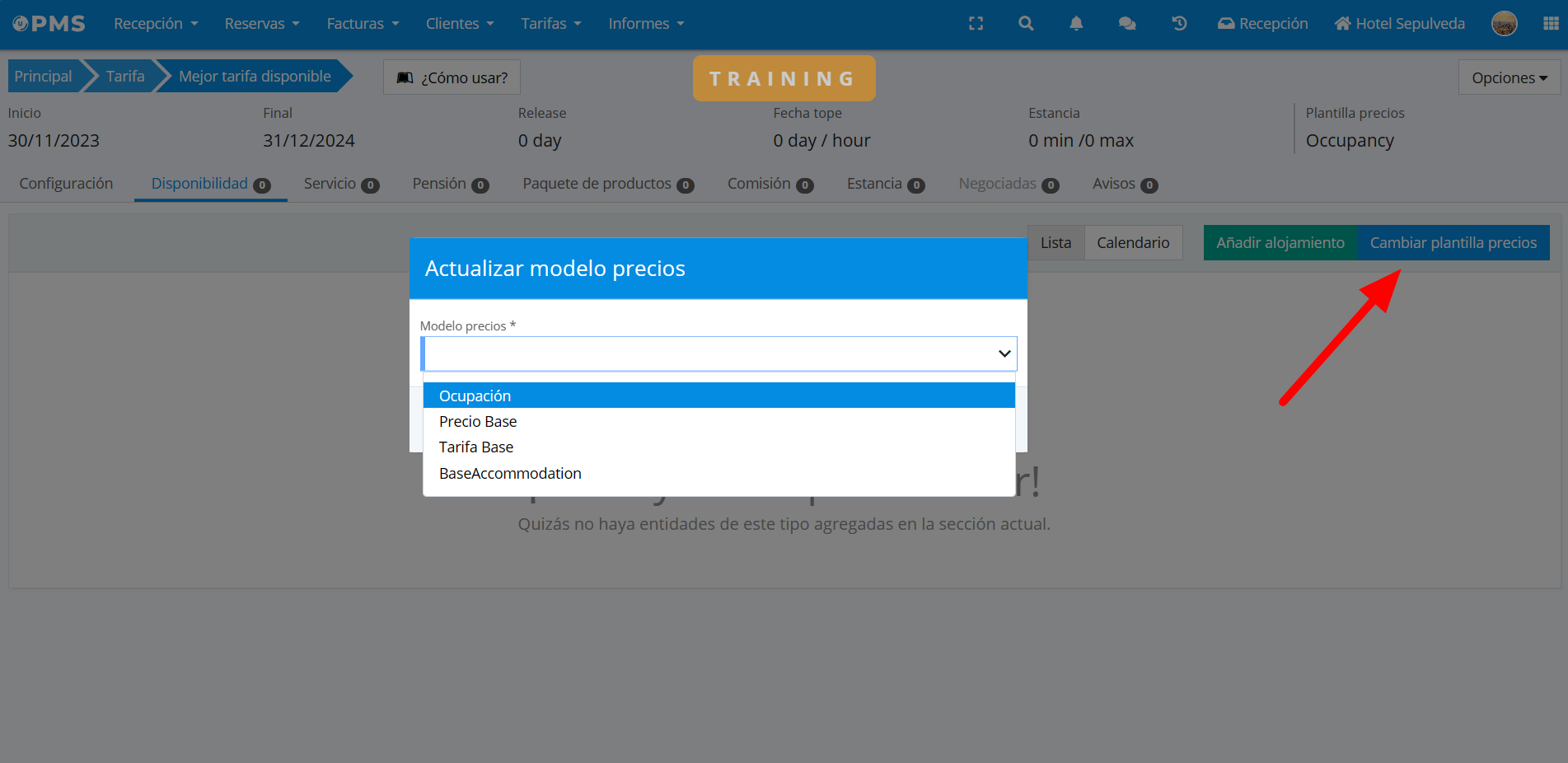 Dans le tarif, pour sélectionner l'un des modèles, nous irons à l'onglet Disponibilité et cliquerons sur le bouton Changer le modèle de prix.