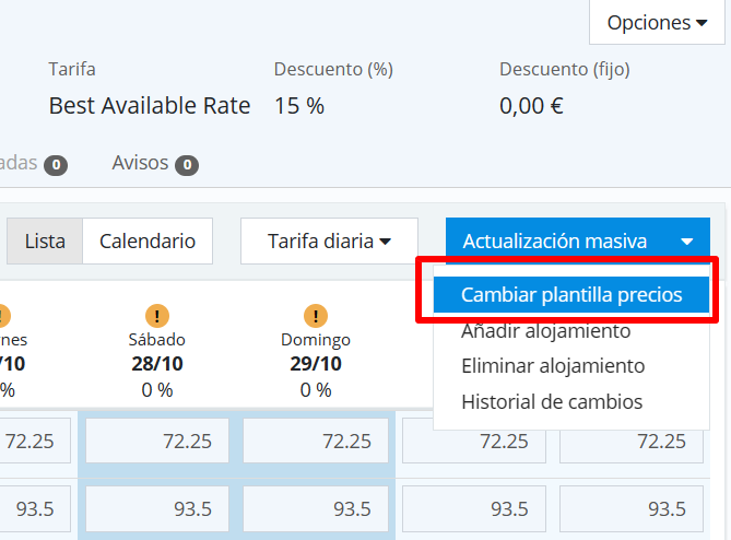 Si nous voulions modifier la remise ou l'augmentation du tarif par rapport à celui pris comme référence, nous devrions retourner sélectionner l'option Changer le modèle de prix (dans la section disponibilité) pour qu'il nous affiche les cases des remises.