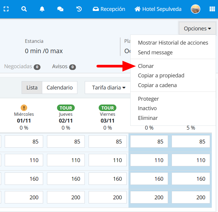 Pour cela, une fois que nous avons créé un tarif, une offre ou une promotion, nous irons à > Options > Cloner