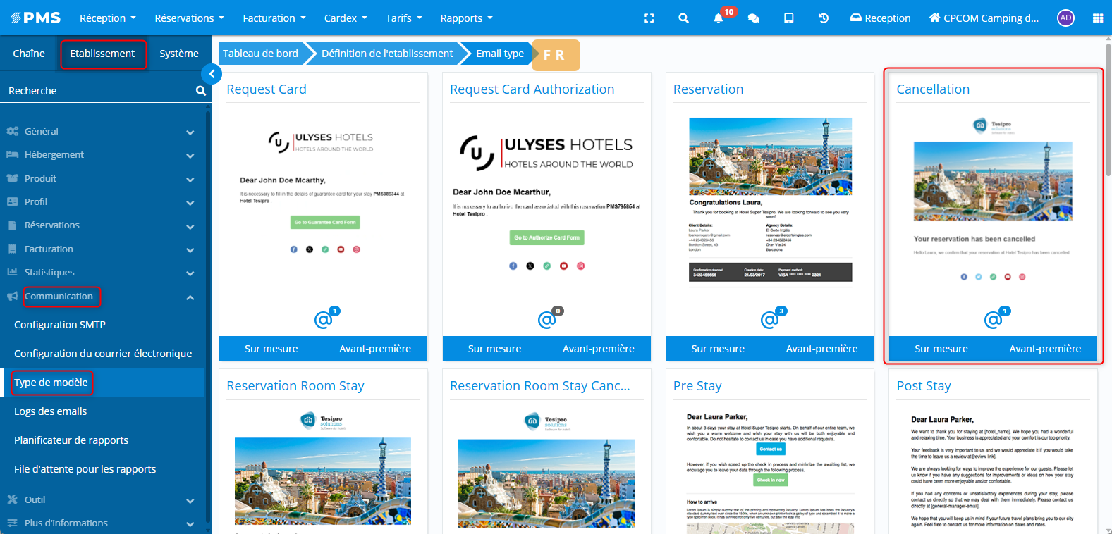 Configuration de l'établissement > Communication > Type de modèle