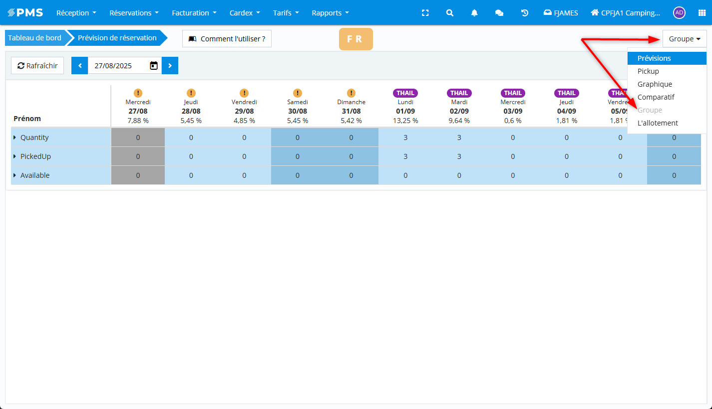 La prévision des groupes est accessible depuis la fenêtre de prévision des réservations :