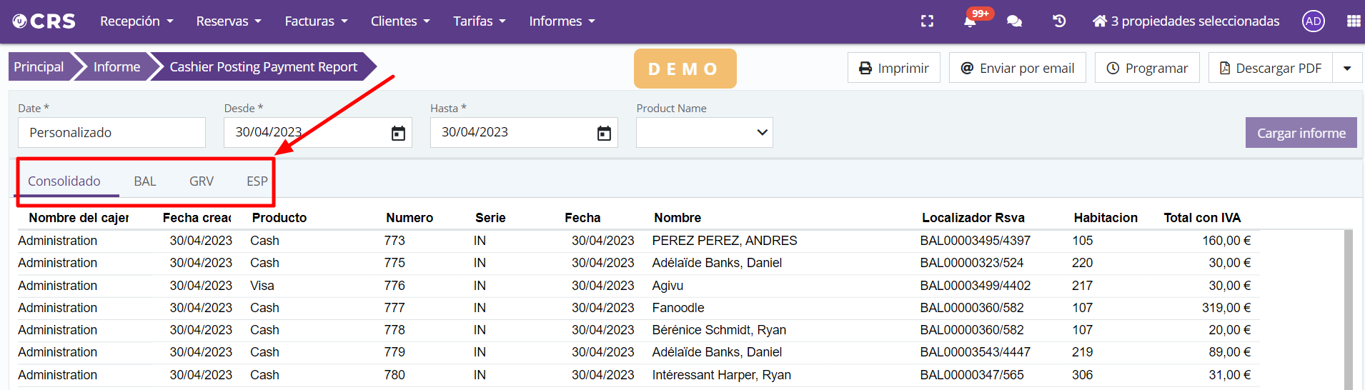 - Ajout de l’option pour visualiser les rapports suivants de deux manières : consolidée, regroupant toutes les propriétés de la chaîne, ou séparée par établissement :